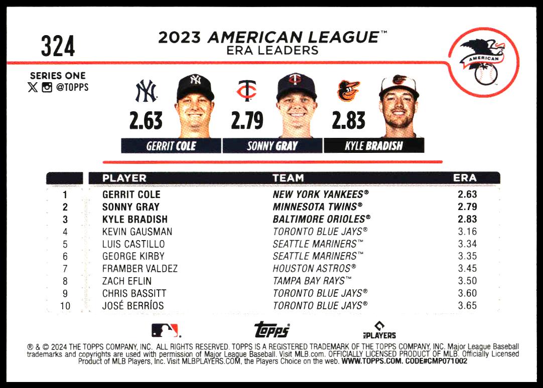 This Baseball card, from 2024 is part of the Topps Series 1 card set. American League Leaders (Cole / Sonny Gray / Kyle BrGerrit adish) is featured and has a card number of 324.
