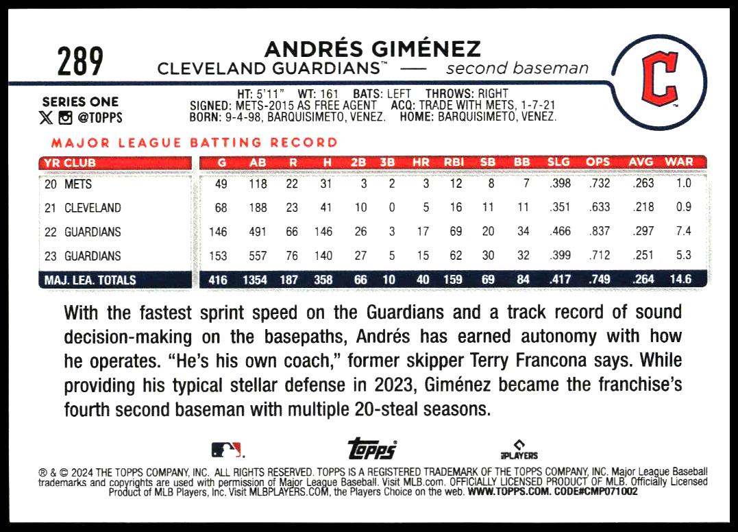 This Baseball card, from 2024 is part of the Topps Series 1 card set. Andrés Giménez is featured and has a card number of 289.
