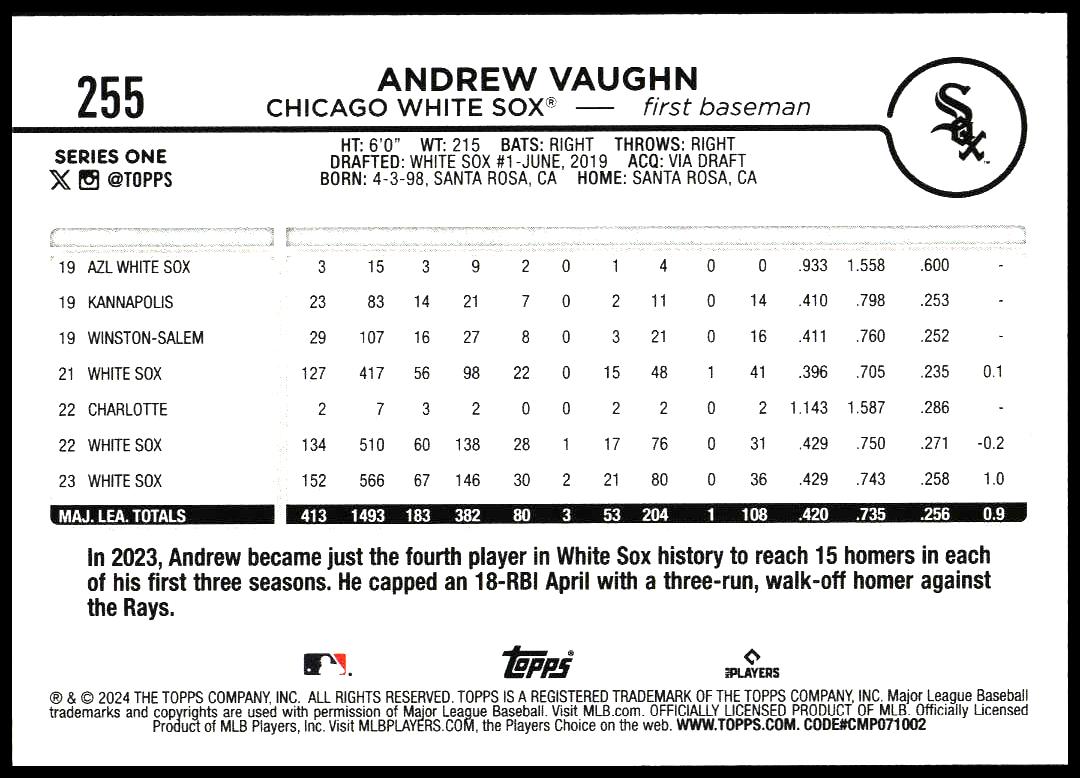 This Baseball card, from 2024 is part of the Topps Series 1 card set. Andrew Vaughn is featured and has a card number of 255.
