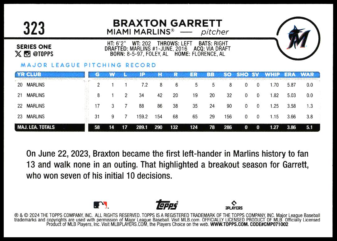 This BaseballΒ card, from 2024 is part of the Topps Series 1Β card set. Braxton Garrett is featured and has a card number of 323.