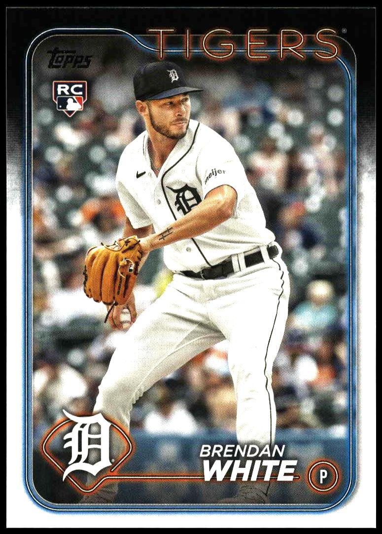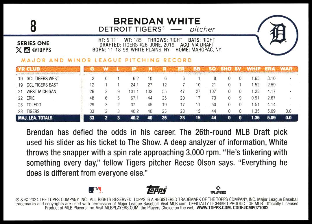 This Baseball card, from 2024 is part of the Topps Series 1 card set. Brendan White is featured and has a card number of 8.