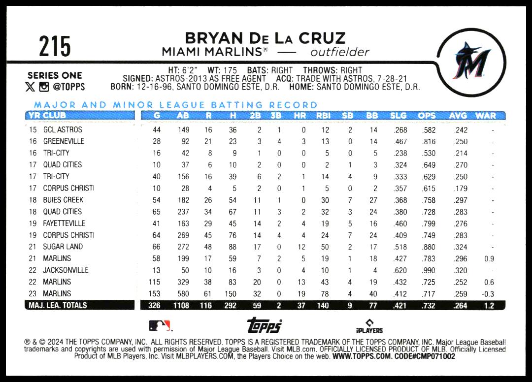 This BaseballΒ card, from 2024 is part of the Topps Series 1Β card set. Bryan De La Cruz is featured and has a card number of 215.