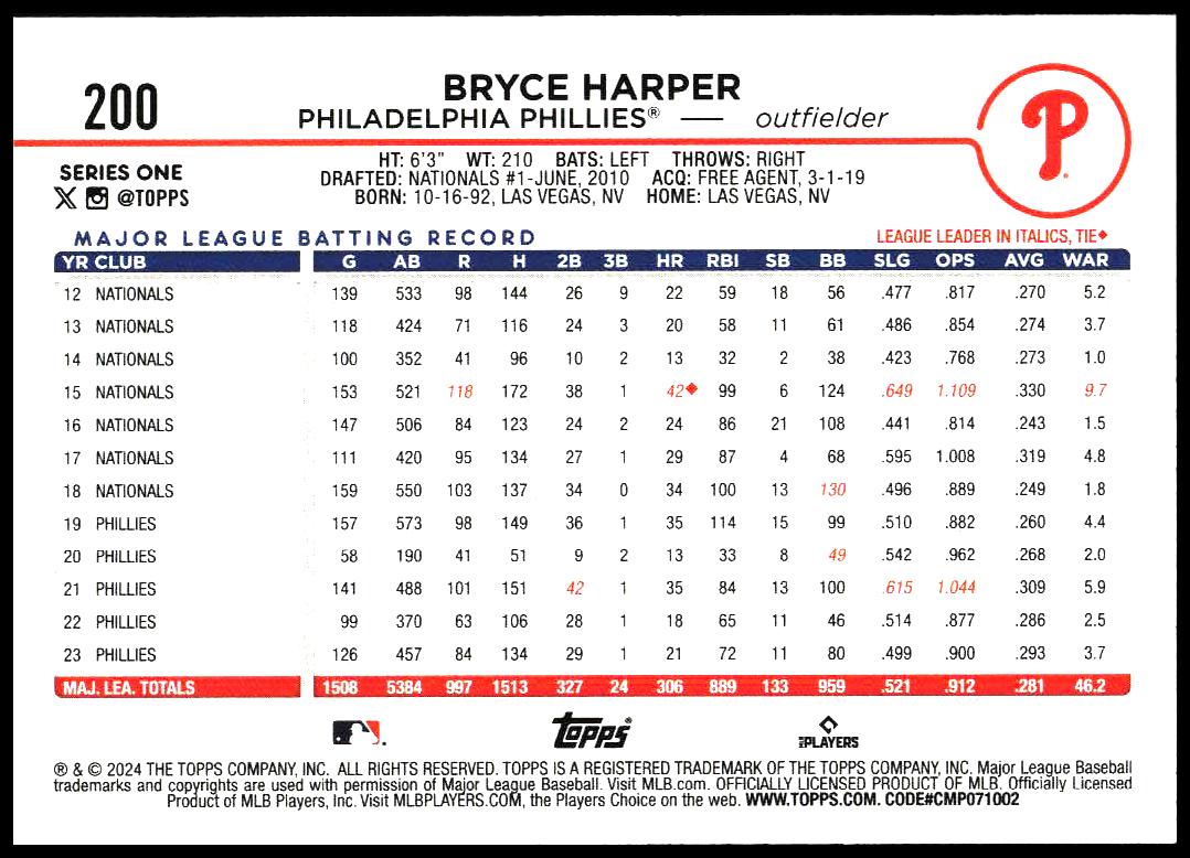 This BaseballΒ card, from 2024 is part of the Topps Series 1Β card set. Bryce Harper is featured and has a card number of 200.