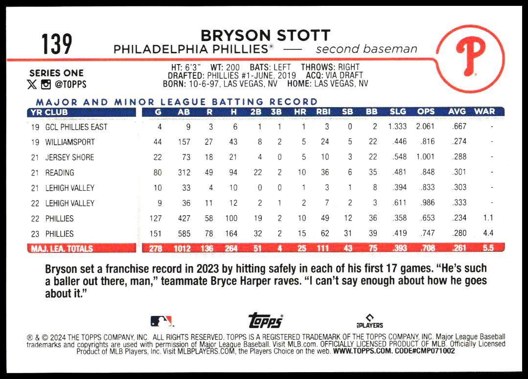 This BaseballΒ card, from 2024 is part of the Topps Series 1Β card set. Bryson Stott is featured and has a card number of 139.