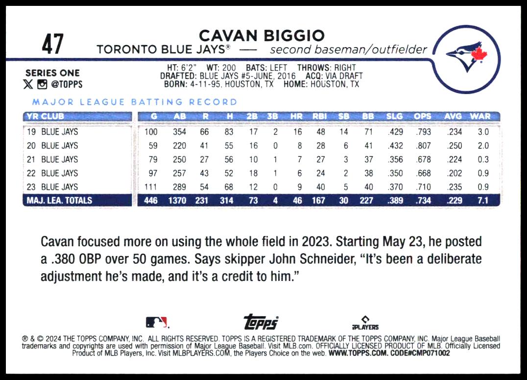 This Baseball card, from 2024 is part of the Topps Series 1 card set. Cavan Biggio is featured and has a card number of 47.