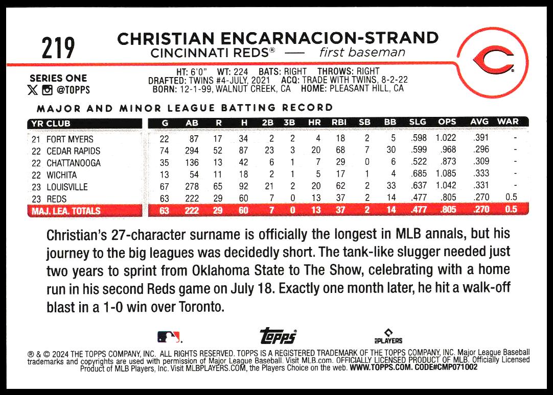 This Baseball card, from 2024 is part of the Topps Series 1 card set. Christian Encarnacion-Strand is featured and has a card number of 219.