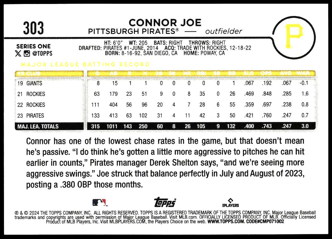 This Baseball card, from 2024 is part of the Topps Series 1 card set. Connor Joe is featured and has a card number of 303.