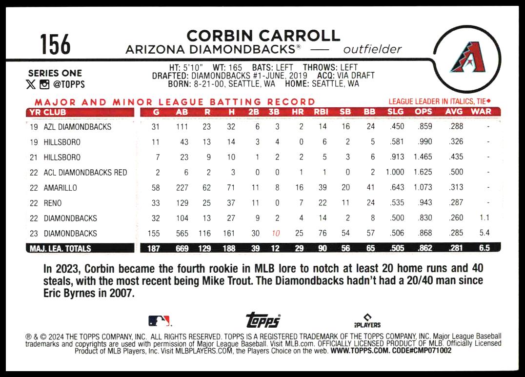 This Baseball card, from 2024 is part of the Topps Series 1 card set. Corbin Carroll is featured and has a card number of 156.