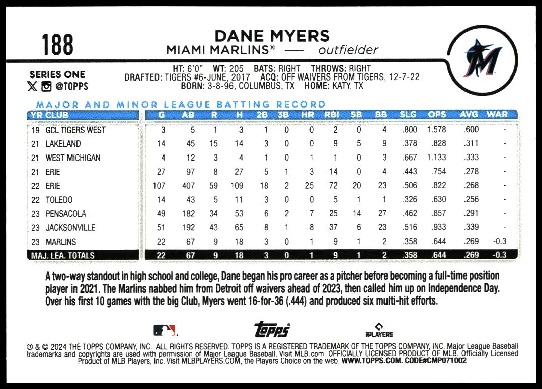 This BaseballΒ card, from 2024 is part of the Topps Series 1Β card set. Dane Myers is featured and has a card number of 188.