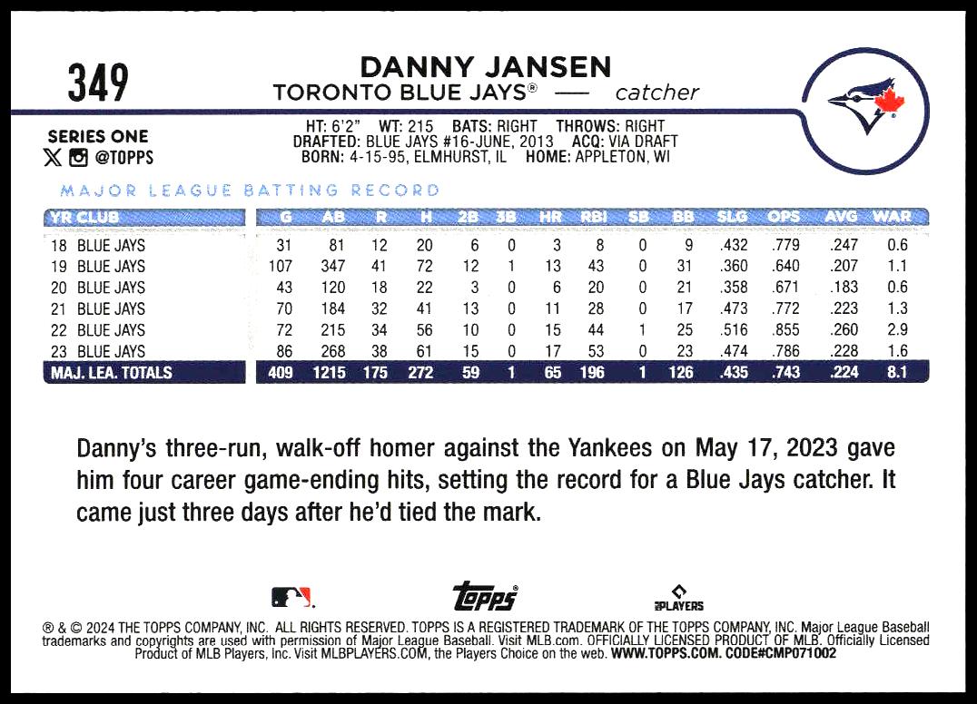 This BaseballΒ card, from 2024 is part of the Topps Series 1Β card set. Danny Jansen is featured and has a card number of 349.