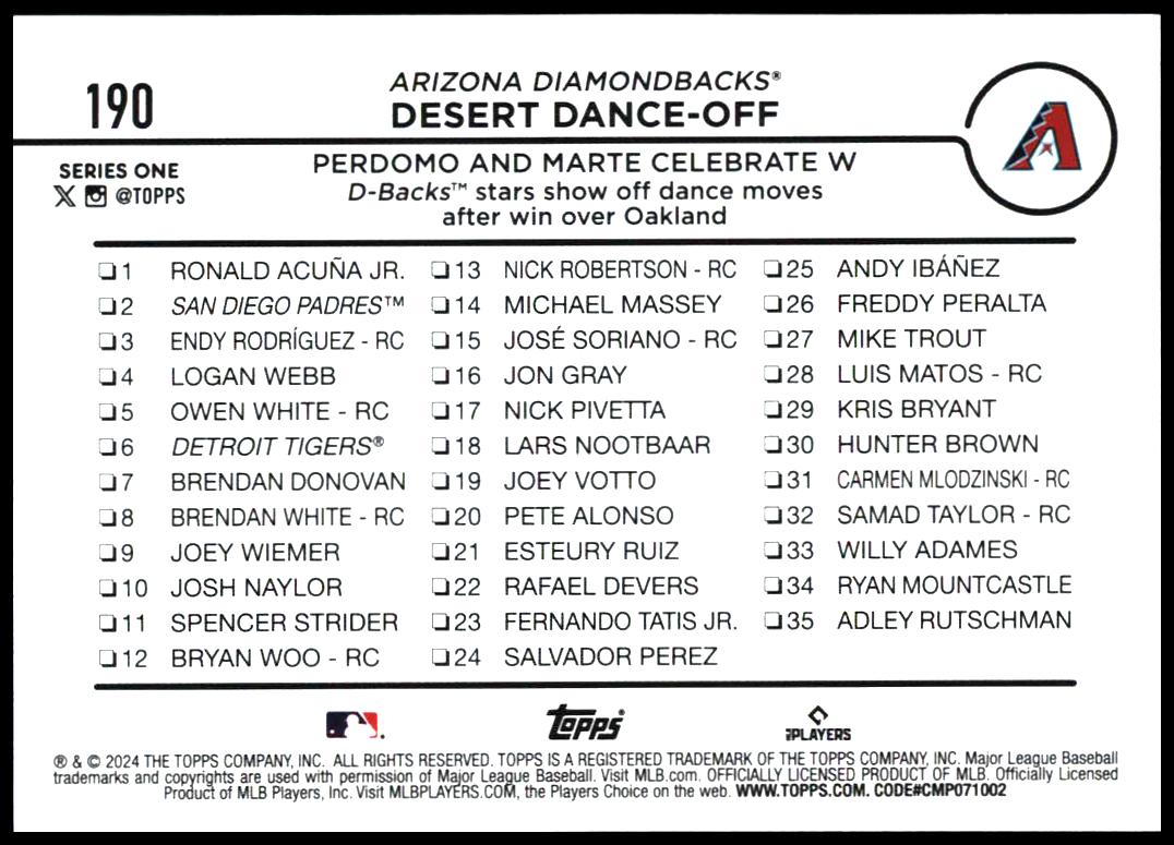 This Baseball card, from 2024 is part of the Topps Series 1 card set. Desert Dance-Off is featured and has a card number of 190.