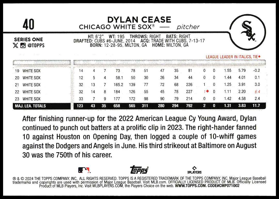 This BaseballΒ card, from 2024 is part of the Topps Series 1Β card set. Dylan Cease is featured and has a card number of 40.