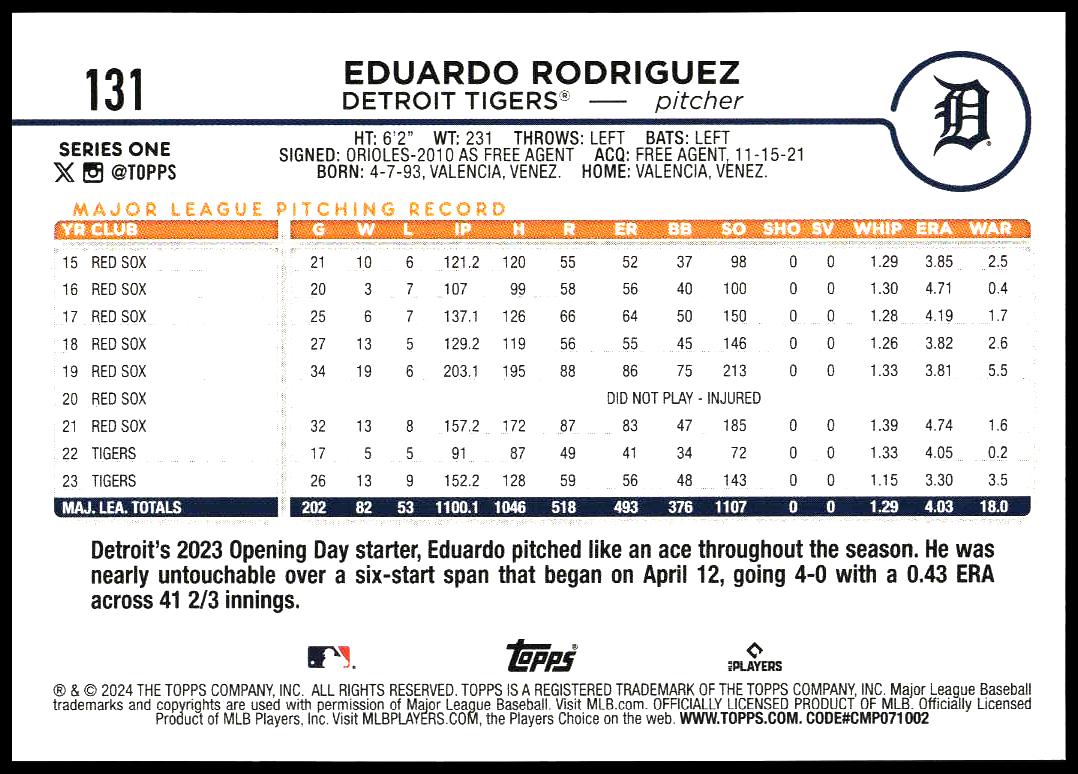 This Baseball card, from 2024 is part of the Topps Series 1 card set. Eduardo Rodriguez is featured and has a card number of 131.