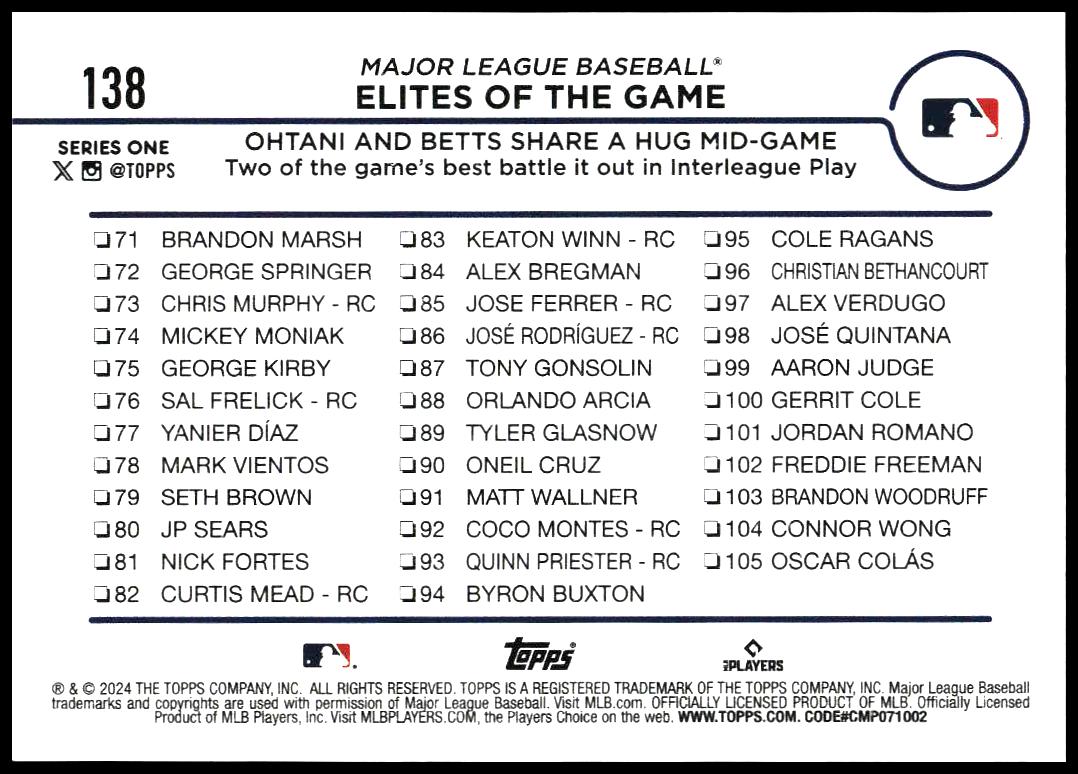 This Baseball card, from 2024 is part of the Topps Series 1 card set. Elites of the Game is featured and has a card number of 138.