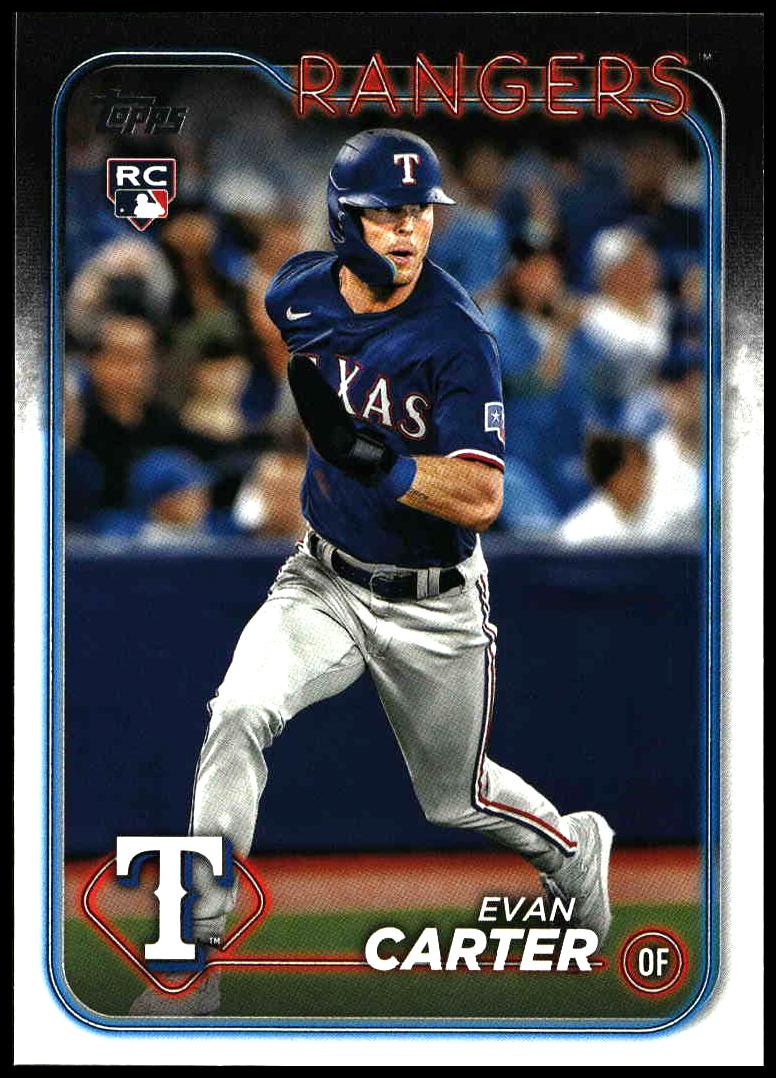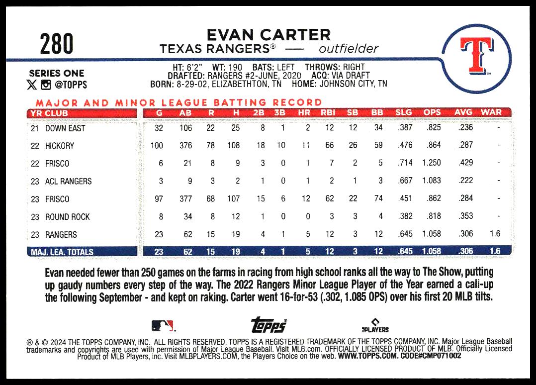 This Baseball card, from 2024 is part of the Topps Series 1 card set. Evan Carter is featured and has a card number of 280.