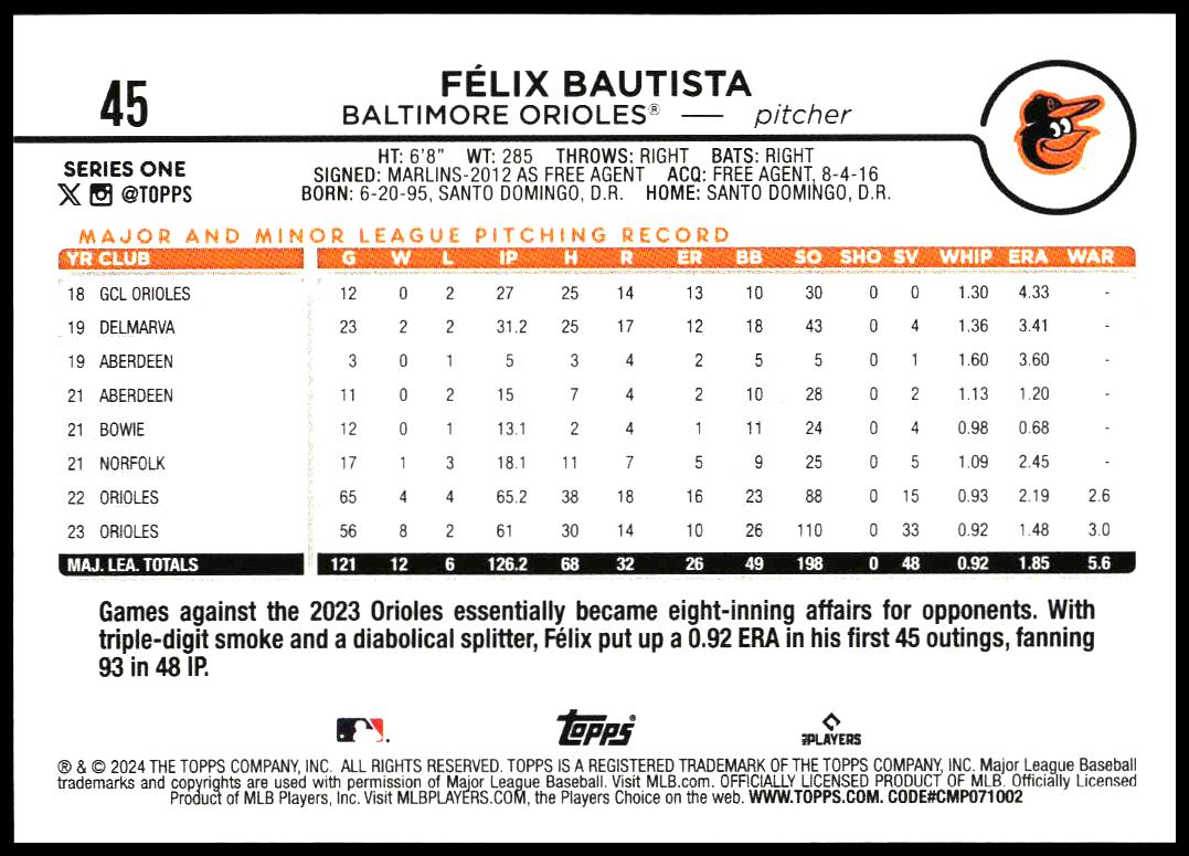 This Baseball card, from 2024 is part of the Topps Series 1 card set. Félix Bautista is featured and has a card number of 45.