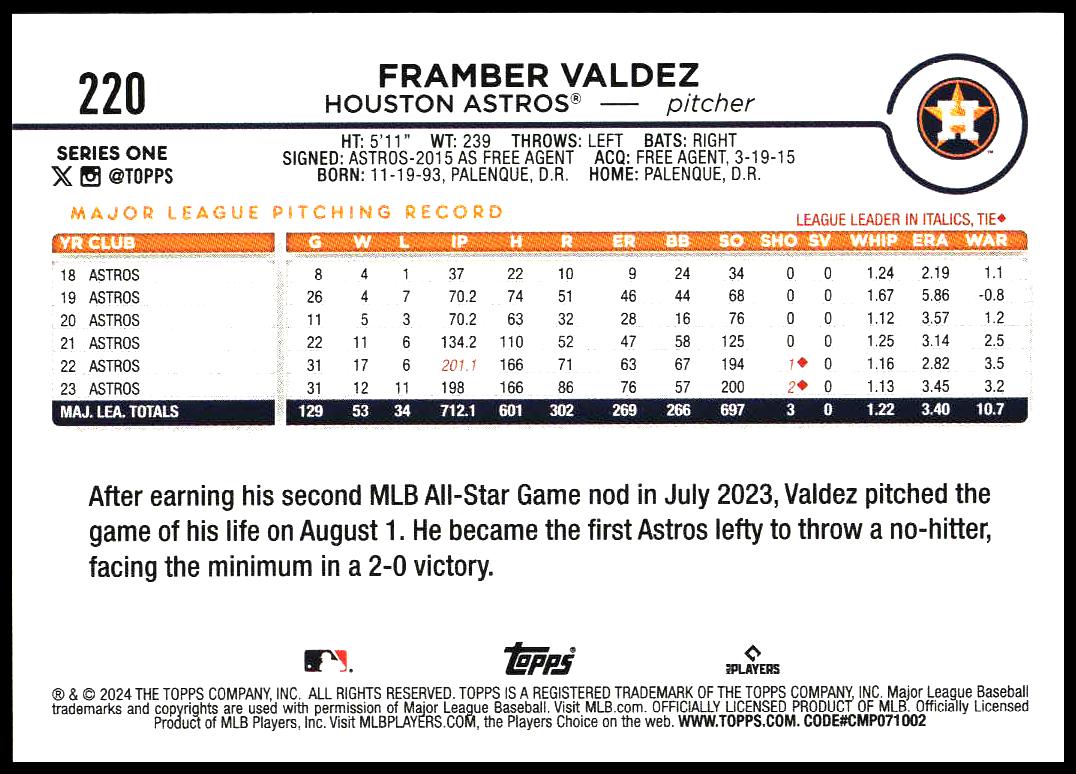 This BaseballΒ card, from 2024 is part of the Topps Series 1Β card set. Framber Valdez is featured and has a card number of 220.
