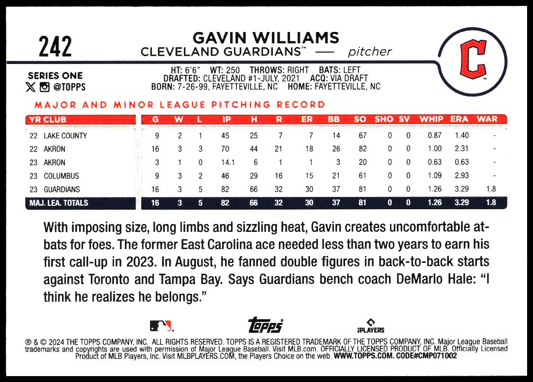 2024 Topps Series 1 Gavin Williams #242