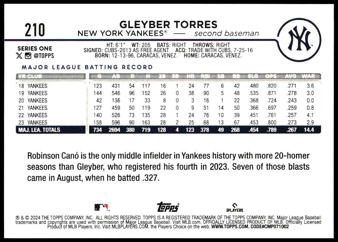 This Baseball card, from 2024 is part of the Topps Series 1 card set. Gleyber Torres is featured and has a card number of 210.