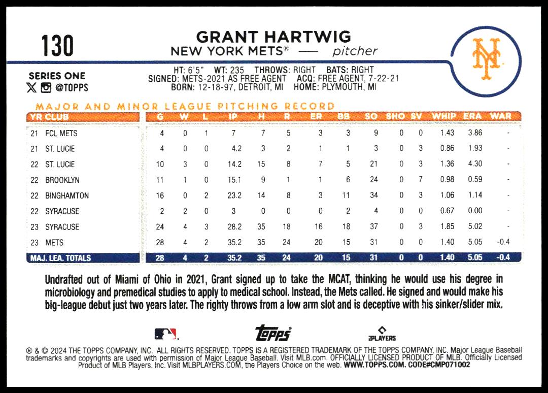 This Baseball card, from 2024 is part of the Topps Series 1 card set. Grant Hartwig is featured and has a card number of 130.