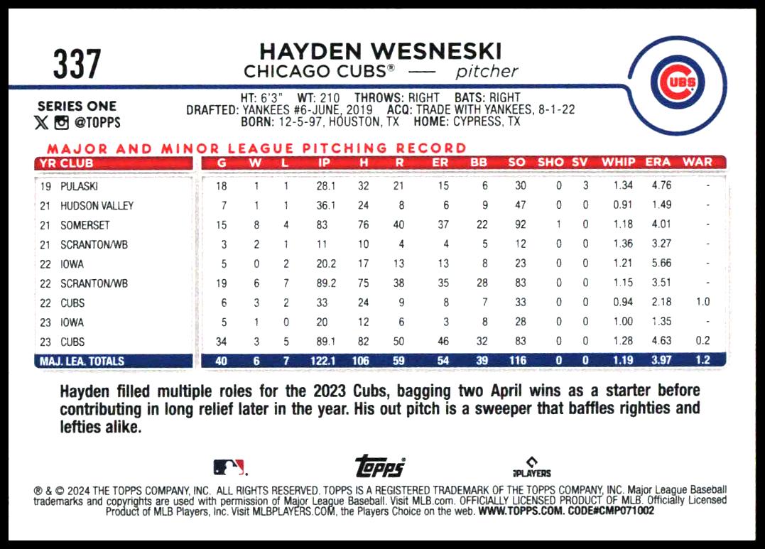 This Baseball card, from 2024 is part of the Topps Series 1 card set. Hayden Wesneski is featured and has a card number of 337.