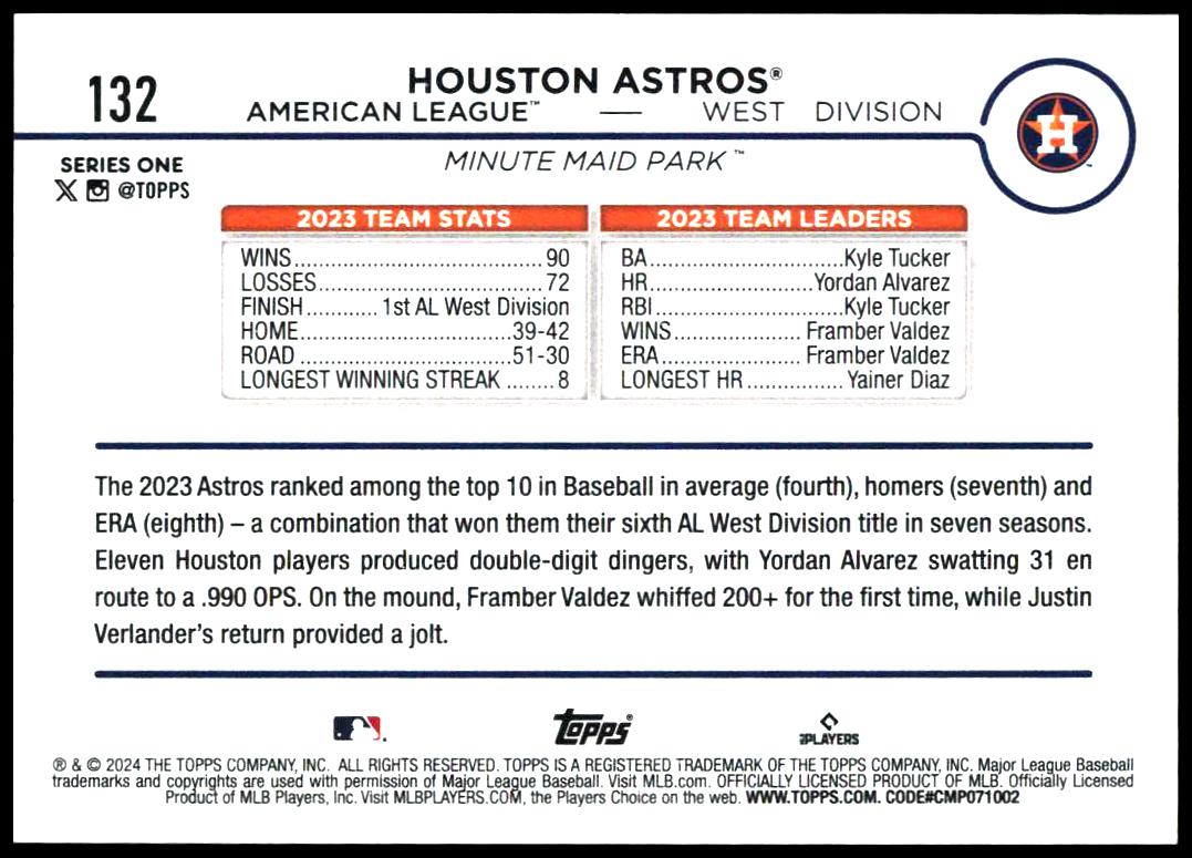This Baseball card, from 2024 is part of the Topps Series 1 card set. Houston Astros is featured and has a card number of 132.