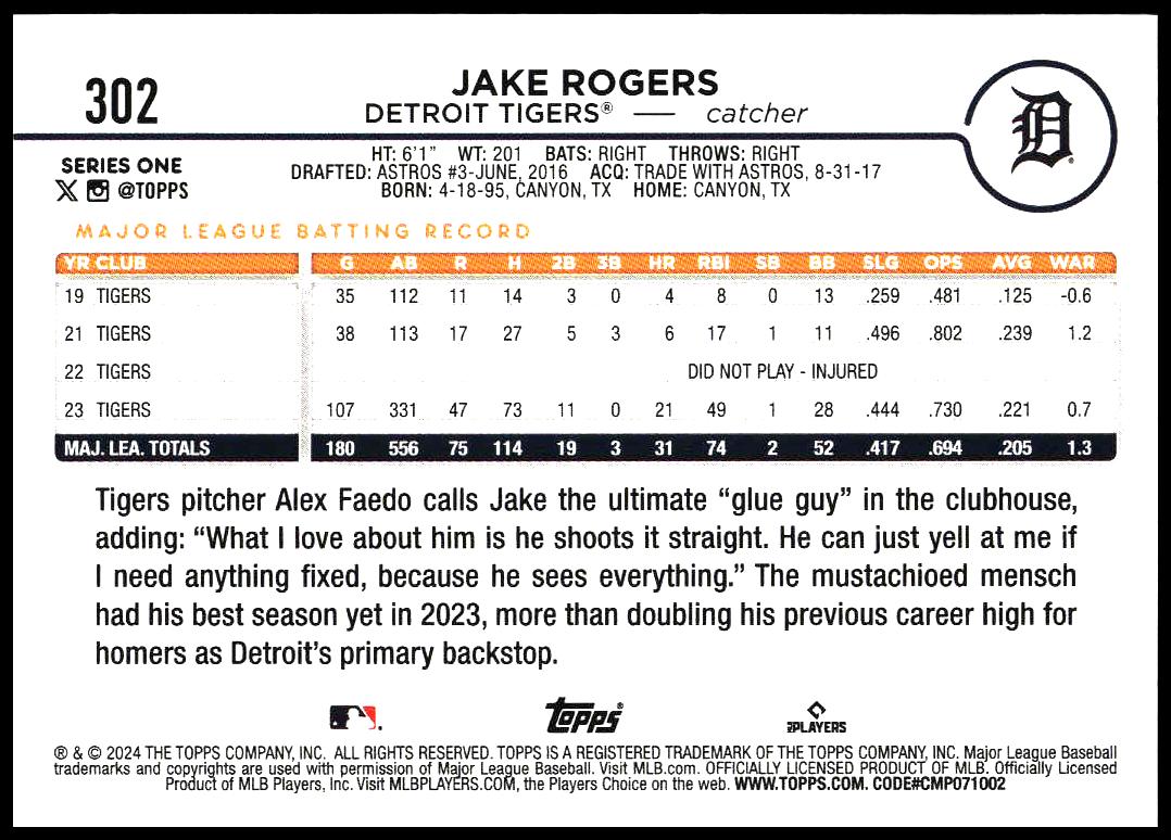 This Baseball card, from 2024 is part of the Topps Series 1 card set. Jake Rogers is featured and has a card number of 302.