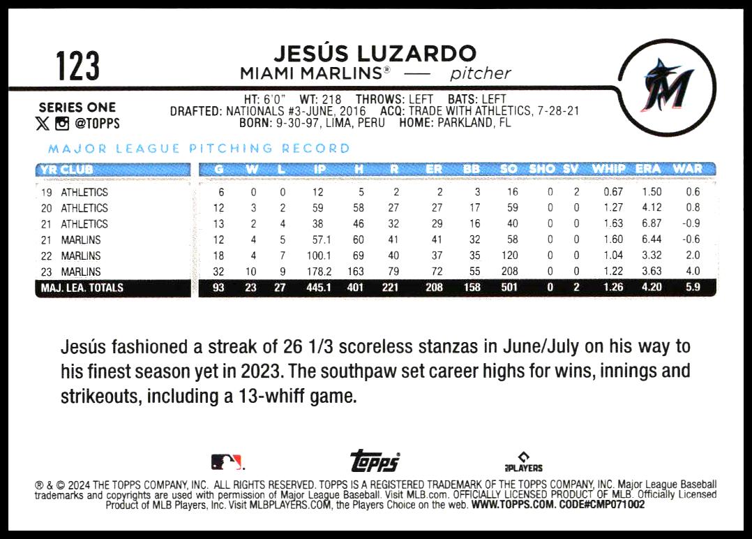 This Baseball card, from 2024 is part of the Topps Series 1 card set. Jesú Luzardo is featured and has a card number of 123.