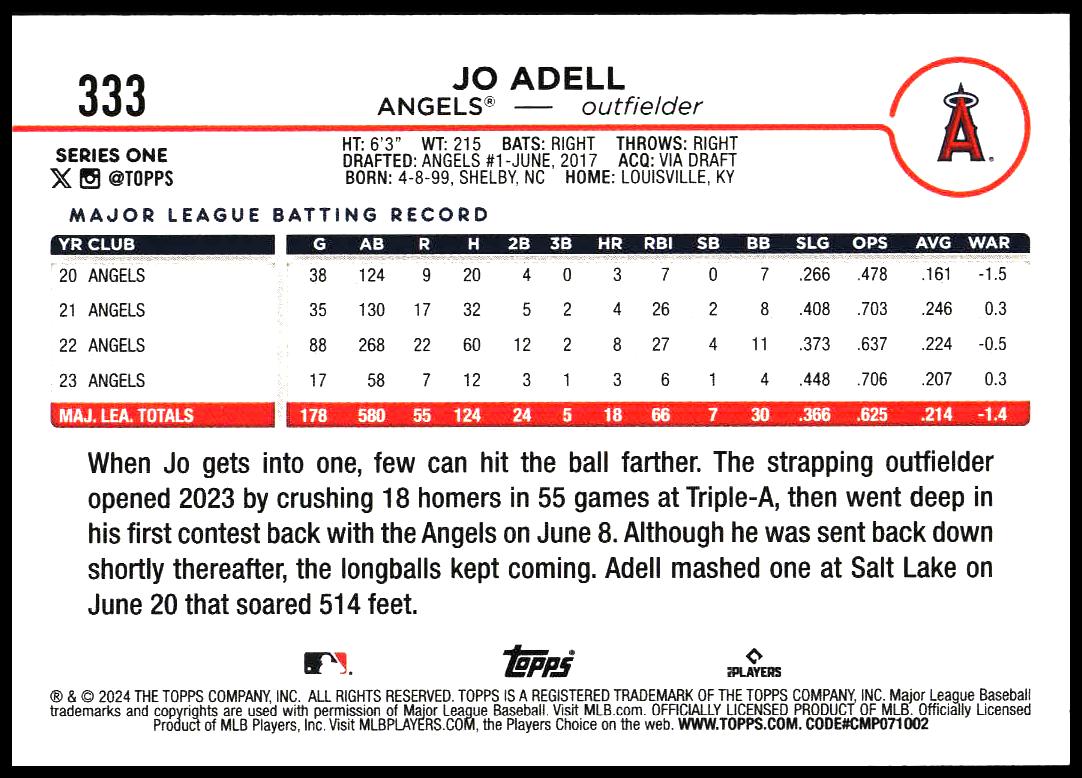 This Baseball card, from 2024 is part of the Topps Series 1 card set. Jo Adell is featured and has a card number of 333.