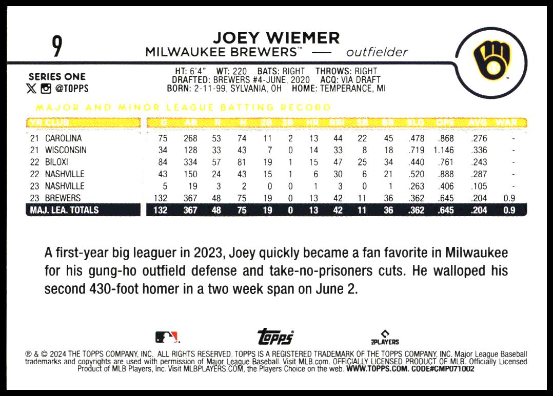 This Baseball card, from 2024 is part of the Topps Series 1 card set. Joey Wiemer is featured and has a card number of 9.