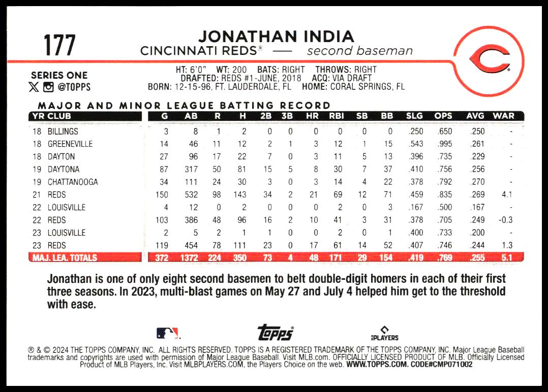 This BaseballΒ card, from 2024 is part of the Topps Series 1Β card set. Jonathan India is featured and has a card number of 177.