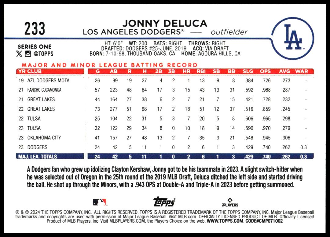 This Baseball card, from 2024 is part of the Topps Series 1 card set. Jonny DeLuca is featured and has a card number of 233.
