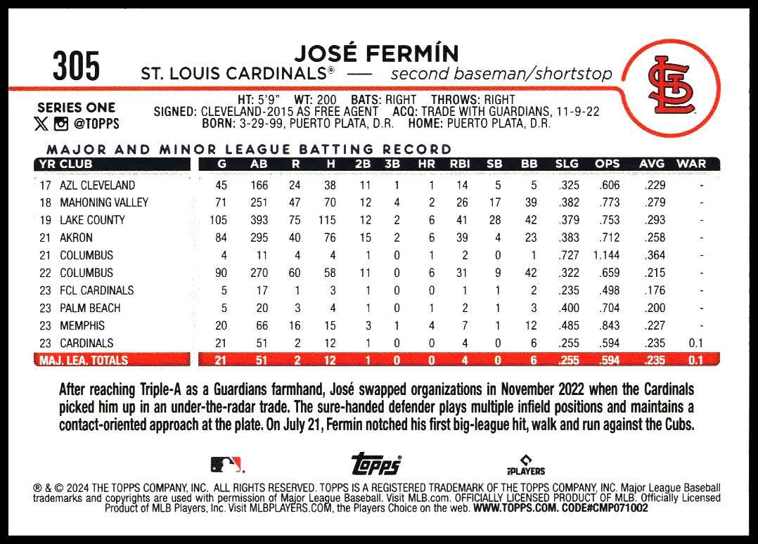 This Baseball card, from 2024 is part of the Topps Series 1 card set. José Fermín is featured and has a card number of 305.
