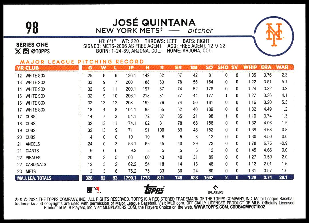 This Baseball card, from 2024 is part of the Topps Series 1 card set. José Quintana is featured and has a card number of 98.