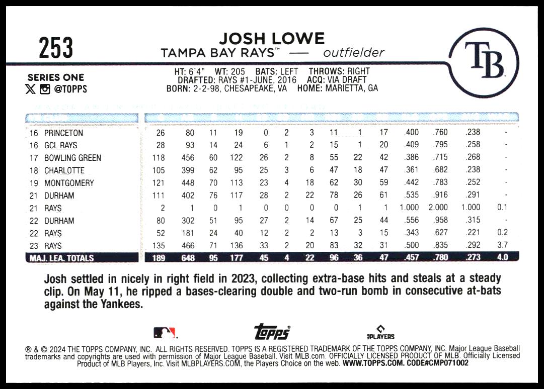 This BaseballΒ card, from 2024 is part of the Topps Series 1Β card set. Josh Lowe is featured and has a card number of 253.