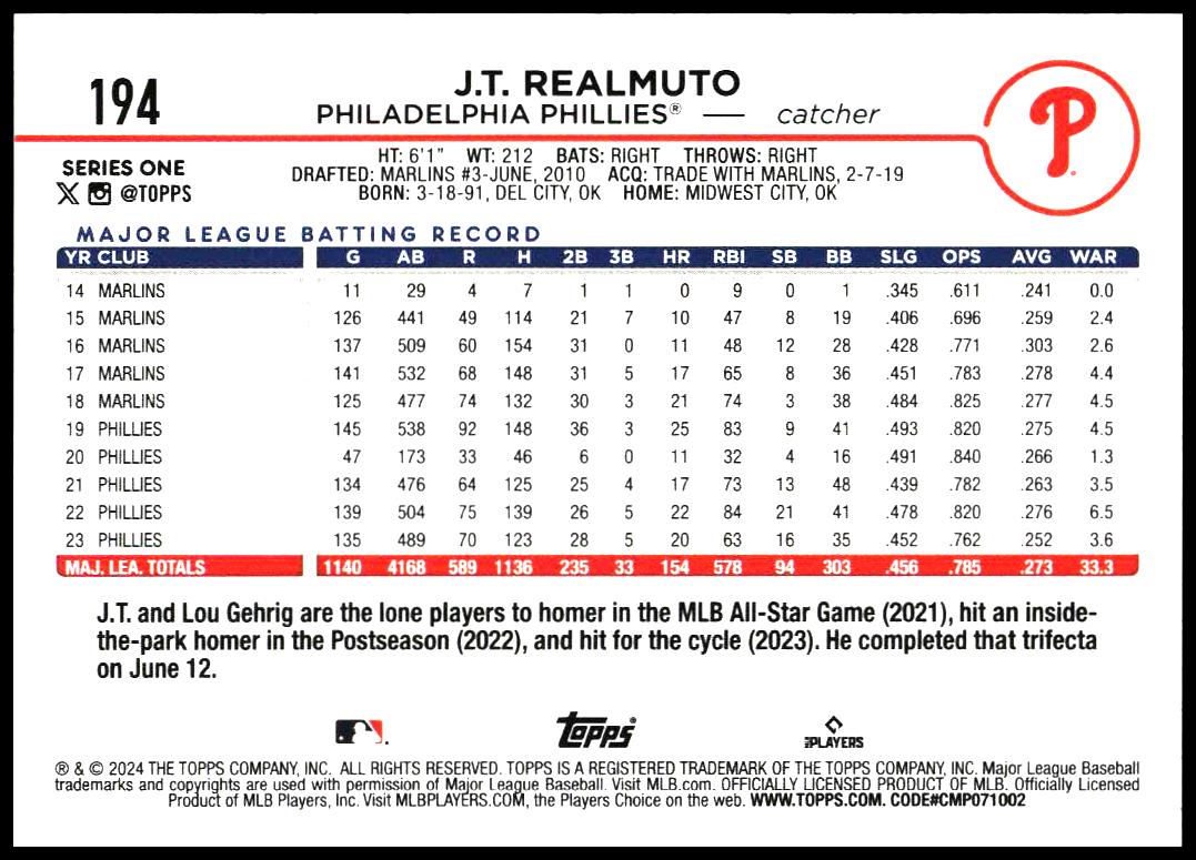 This BaseballΒ card, from 2024 is part of the Topps Series 1Β card set. J.T. Realmuto is featured and has a card number of 194.
