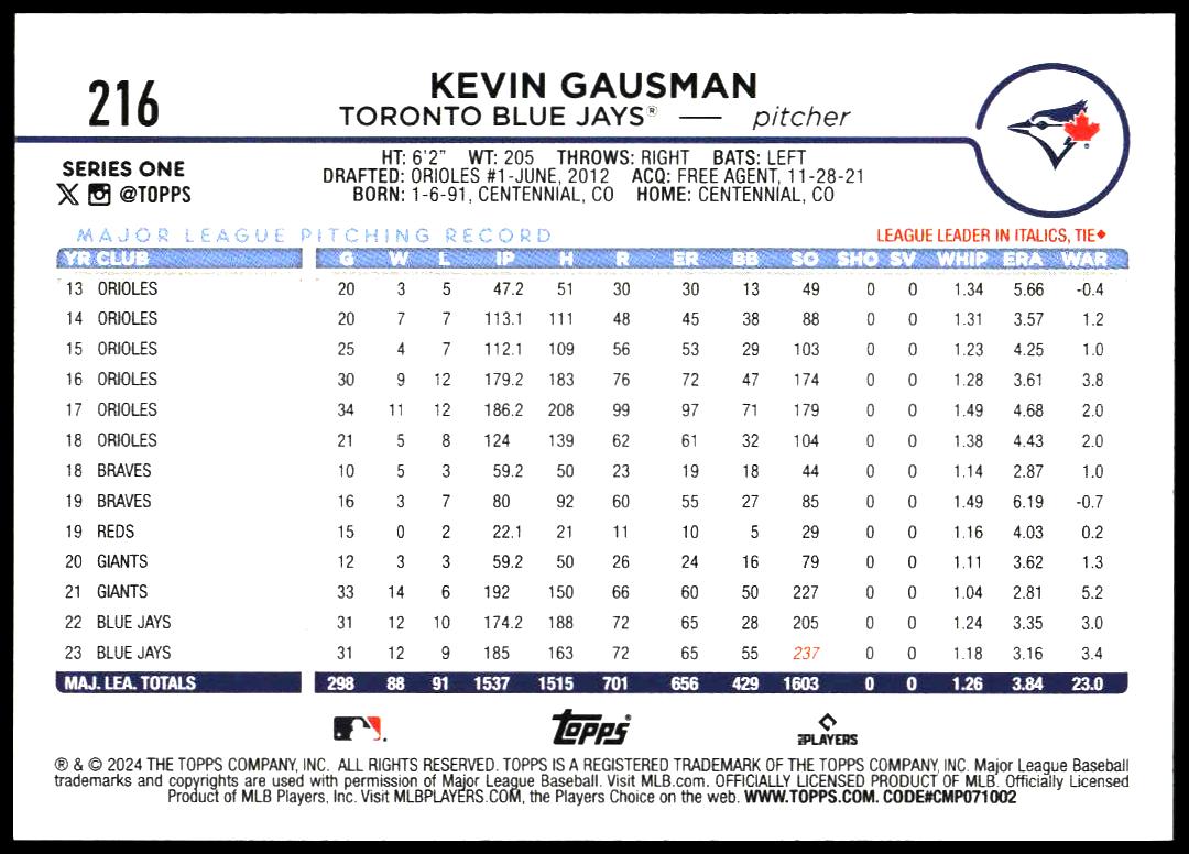 This Baseball card, from 2024 is part of the Topps Series 1 card set. Kevin Gausman is featured and has a card number of 216.