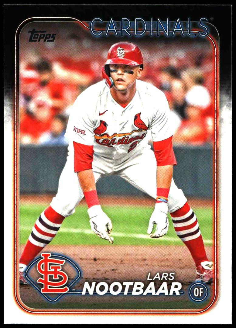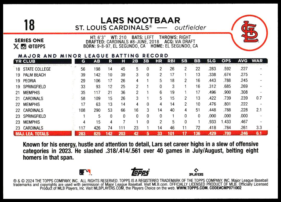 This Baseball card, from 2024 is part of the Topps Series 1 card set. Lars Nootbaar is featured and has a card number of 18.