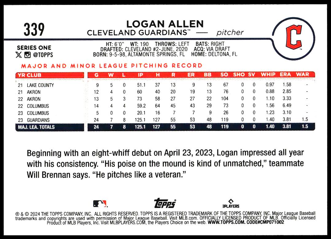 This BaseballΒ card, from 2024 is part of the Topps Series 1Β card set. Logan Allen is featured and has a card number of 339.