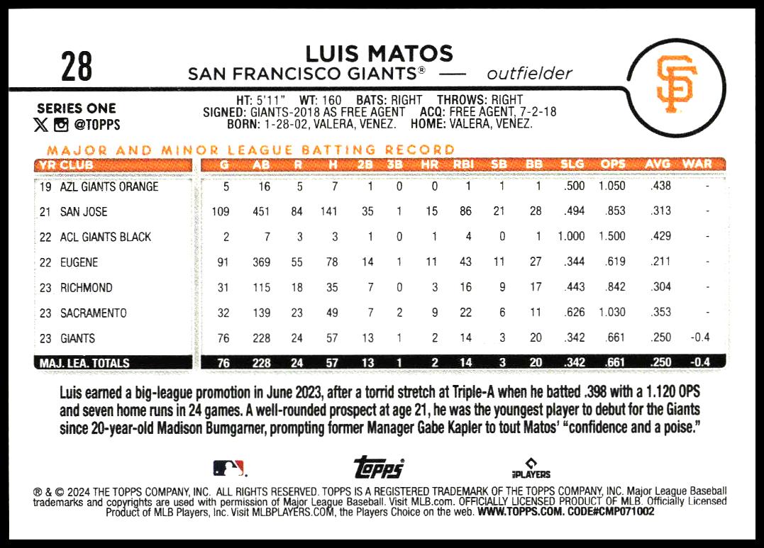 This Baseball card, from 2024 is part of the Topps Series 1 card set. Luis Matos is featured and has a card number of 28.
