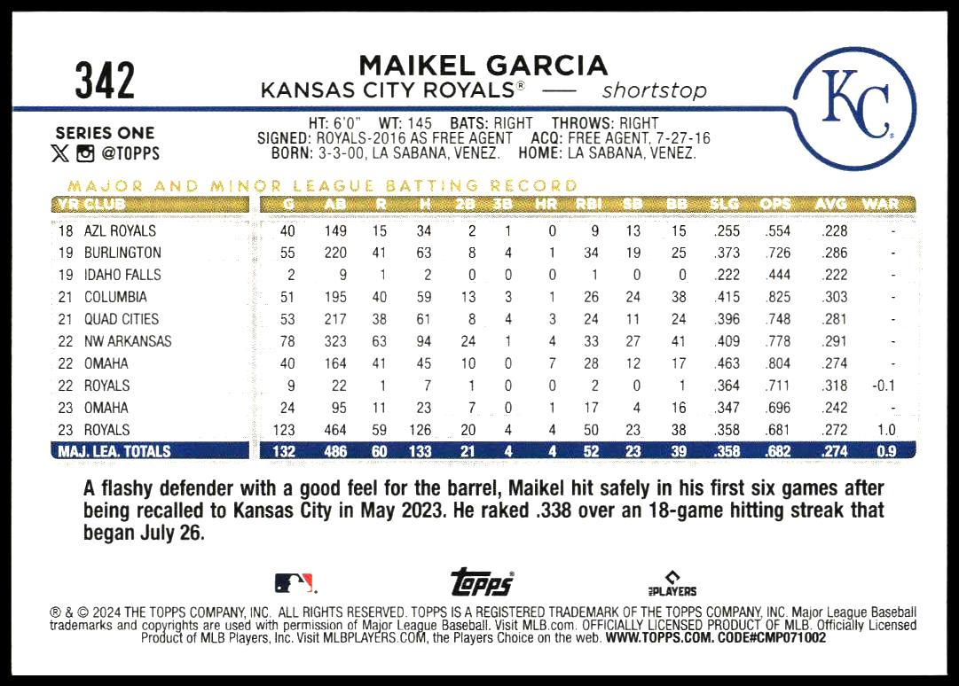 This BaseballΒ card, from 2024 is part of the Topps Series 1Β card set. Maikel Garcia is featured and has a card number of 342.