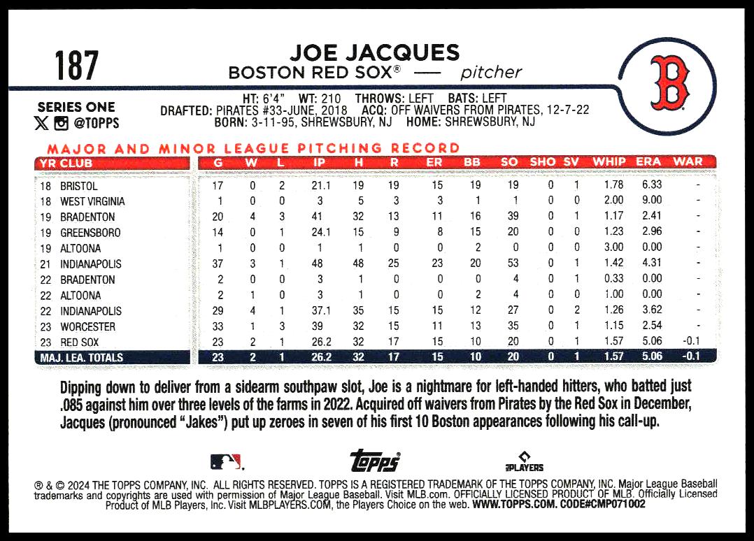 This BaseballΒ card, from 2024 is part of the Topps Series 1Β card set. Matt Thornton is featured and has a card number of 187.