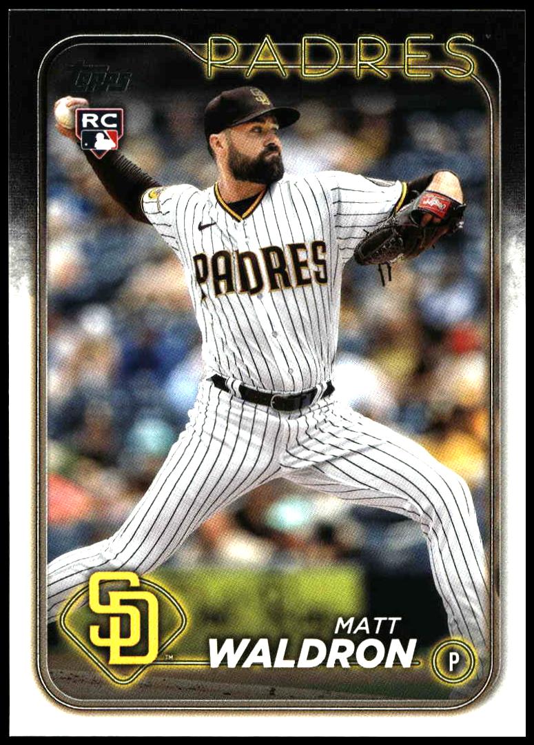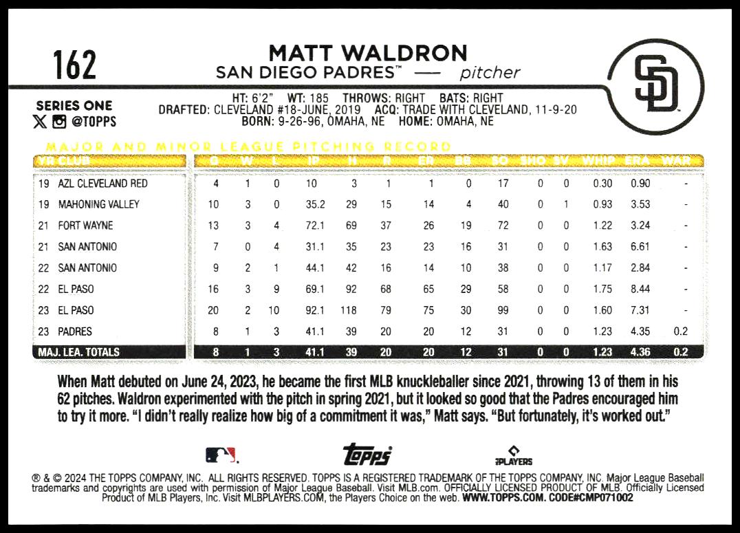 This Baseball card, from 2024 is part of the Topps Series 1 card set. Matt Waldron is featured and has a card number of 162.