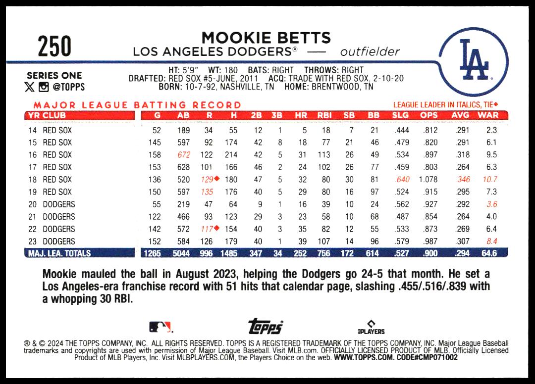 This Baseball card, from 2024 is part of the Topps Series 1 card set. Mookie Betts is featured and has a card number of 250.