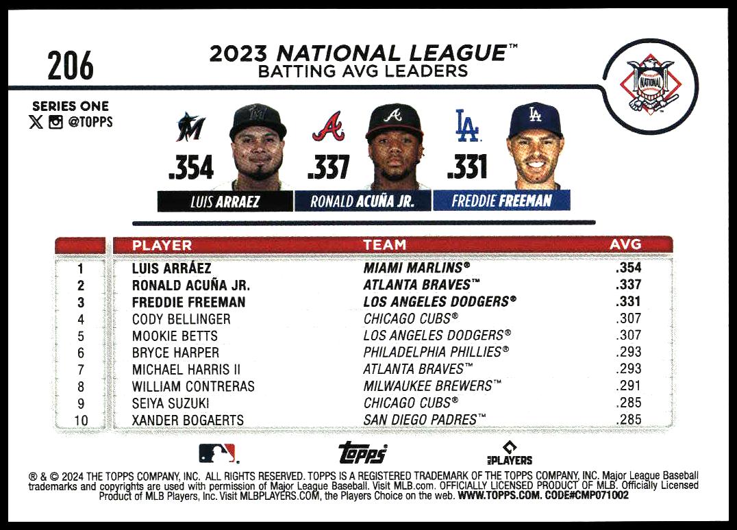 2024 Topps Series 1 National League Leaders (Luis Arraez / Ronald Acuña Jr. / Freddie Freeman) #206