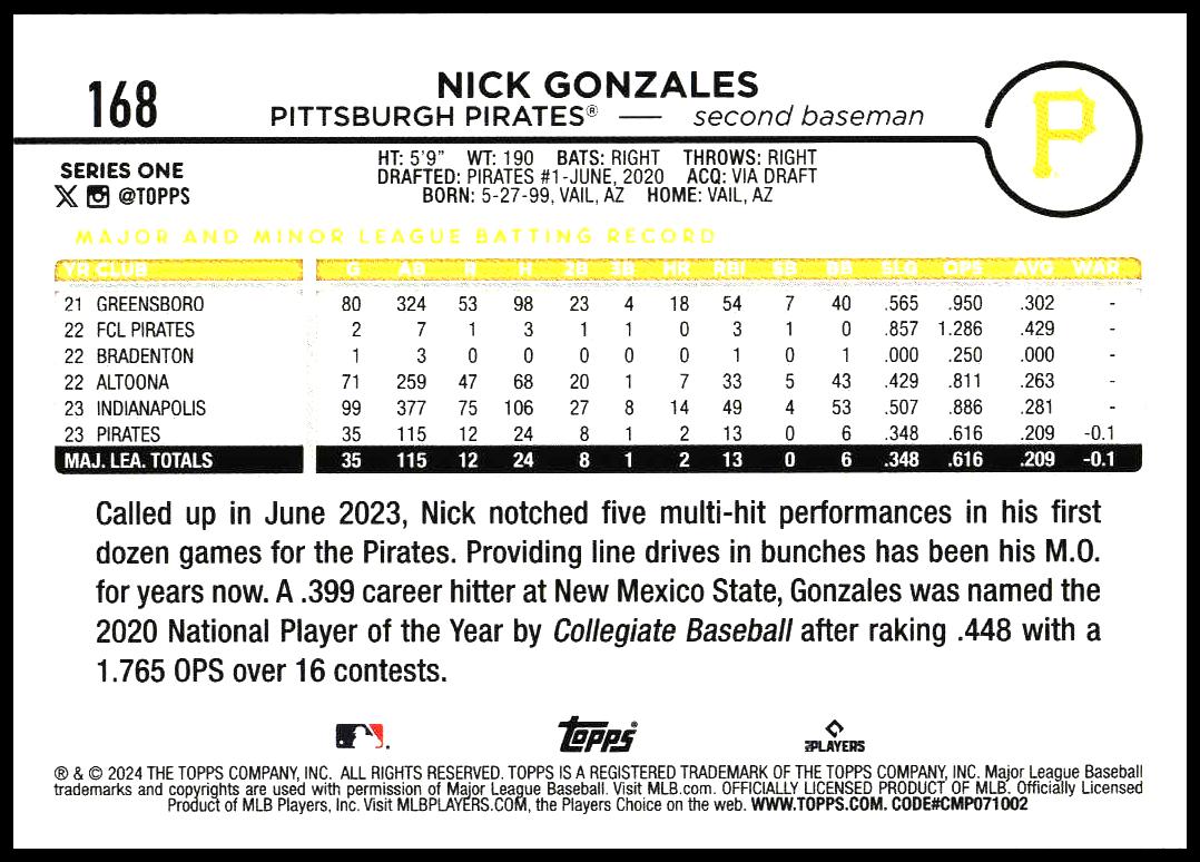 This Baseball card, from 2024 is part of the Topps Series 1 card set. Nick Gonzales is featured and has a card number of 168.
