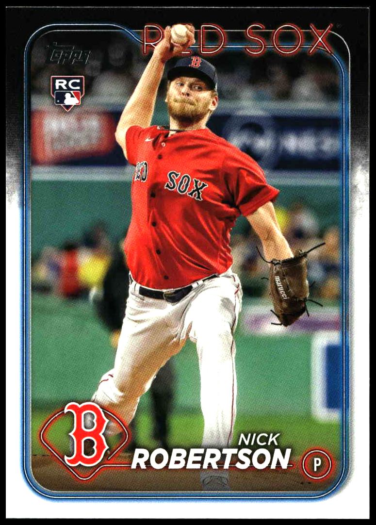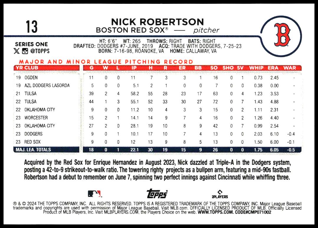 This Baseball card, from 2024 is part of the Topps Series 1 card set. Nick Robertson is featured and has a card number of 13.