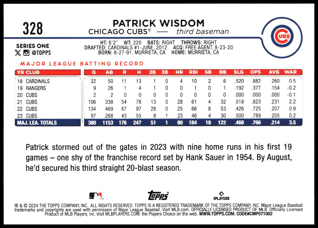 This Baseball card, from 2024 is part of the Topps Series 1 card set. Patrick Wisdom is featured and has a card number of 328.