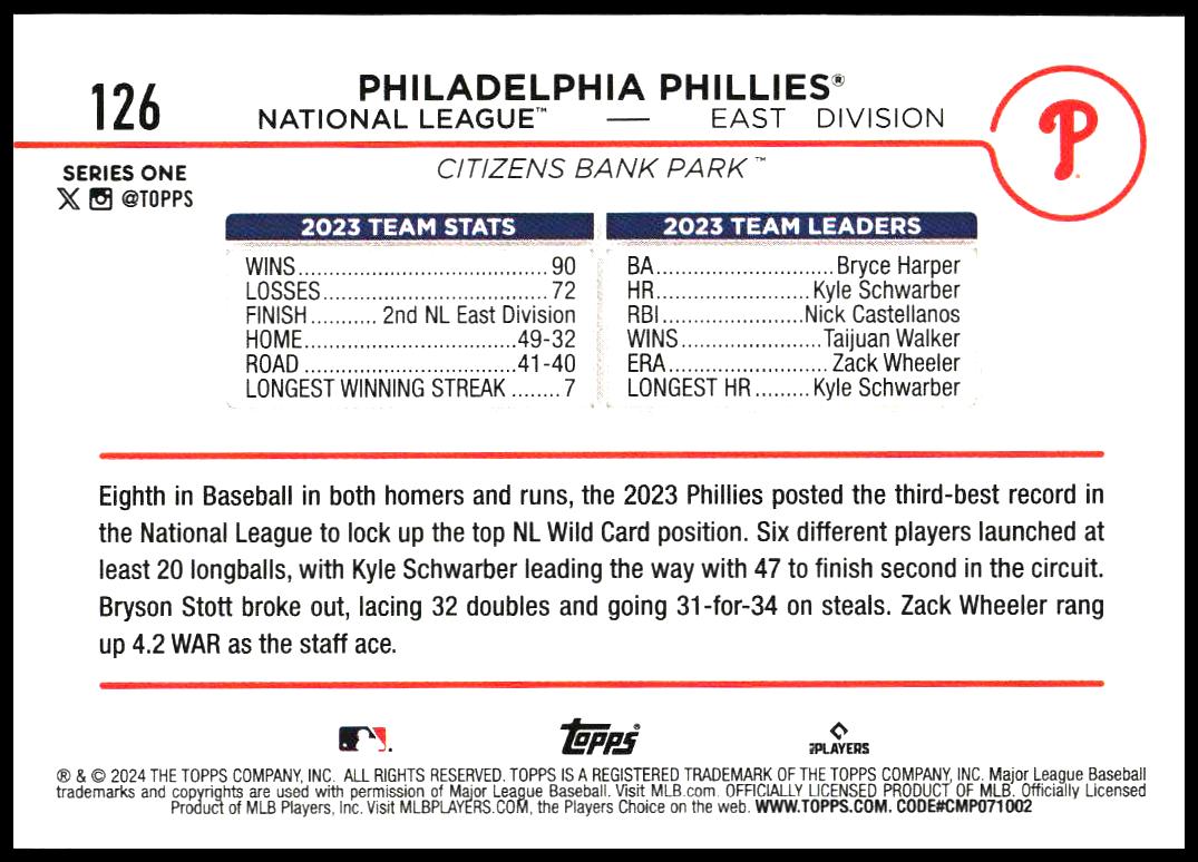 This Baseball card, from 2024 is part of the Topps Series 1 card set. Philadelphia Phillies is featured and has a card number of 126.