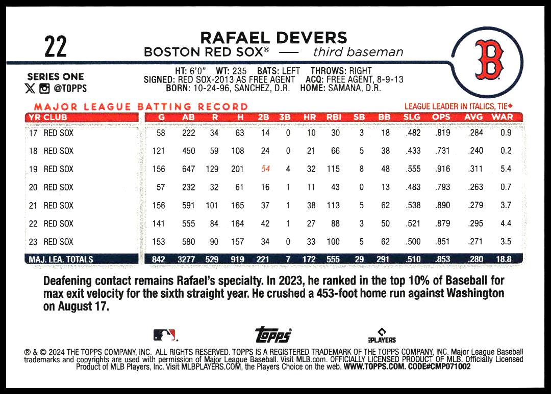 This BaseballΒ card, from 2024 is part of the Topps Series 1Β card set. Rafael Devers is featured and has a card number of 22.